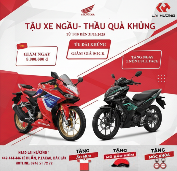 Từ 01/10 đến 31/10/2025, Khách hàng mua xe CBR150R và Winner R nhận ngay ưu đãi khủng, giảm giá shock: – Mua CBR150R giảm ngay 8.000.000 – Mua Winner R tặng ngay 01 Mũ Bảo [...]